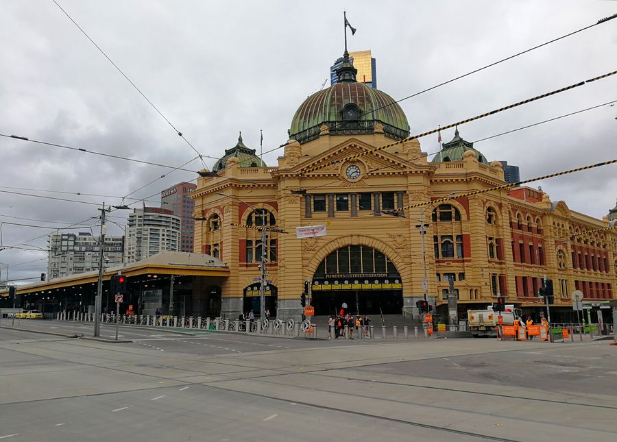 Mobile photo shows few people standing in front of the Flinders Street Station in Melbourne, Australia, March 25, 2020. (Xinhua/Gui Qing)