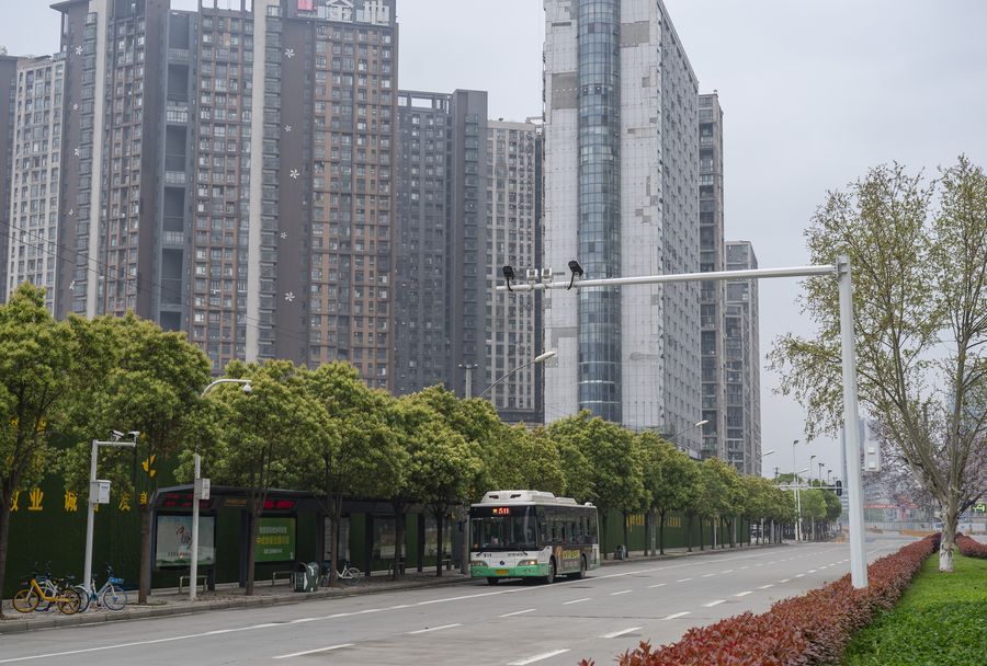 A bus runs on a road in Wuhan, central China's Hubei Province, March 25, 2020. (Xinhua/Cai Yang)