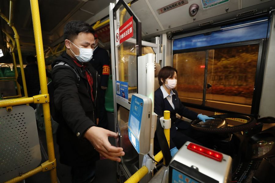A passenger pays the ticket fare with a mobile phone on a bus in Wuhan, central China's Hubei Province, March 25, 2020. (Xinhua/Shen Bohan)