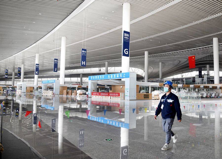 Staff members work at the terminal building of Jiaodong International Airport in Qingdao, east China's Shandong Province, March 25, 2020. (Xinhua/Li Ziheng)