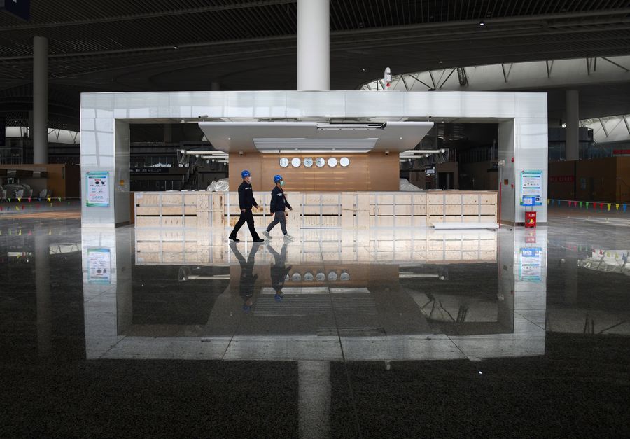 Staff members walk through the departure hall of the terminal building of Jiaodong International Airport in Qingdao, east China's Shandong Province, March 25, 2020. (Xinhua/Li Ziheng)