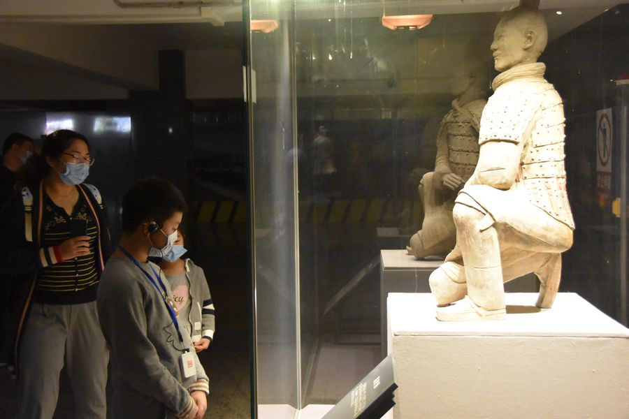 Visitors wearing face masks view an exhibit at the Emperor Qinshihuang's Mausoleum Site Museum in Xi'an, northwest China's Shaanxi Province, March 25, 2020.(Xinhua/Yang Yimiao)