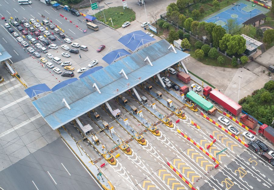 Aerial photo taken on March 26, 2020 shows vehicles queue to pass an expressway toll-gate to enter Wuhan, central China's Hubei Province. Traffic flow at highway exits increased due to a growing number of people returned as Wuhan speeds up resumption of work and production. (Xinhua/Xiao Yijiu)