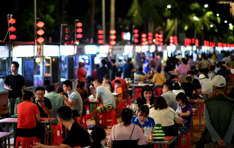People enjoy snacks at a night market in Haikou, capital of south China's Hainan Province, March 26, 2020. (Xinhua/Guo Cheng)