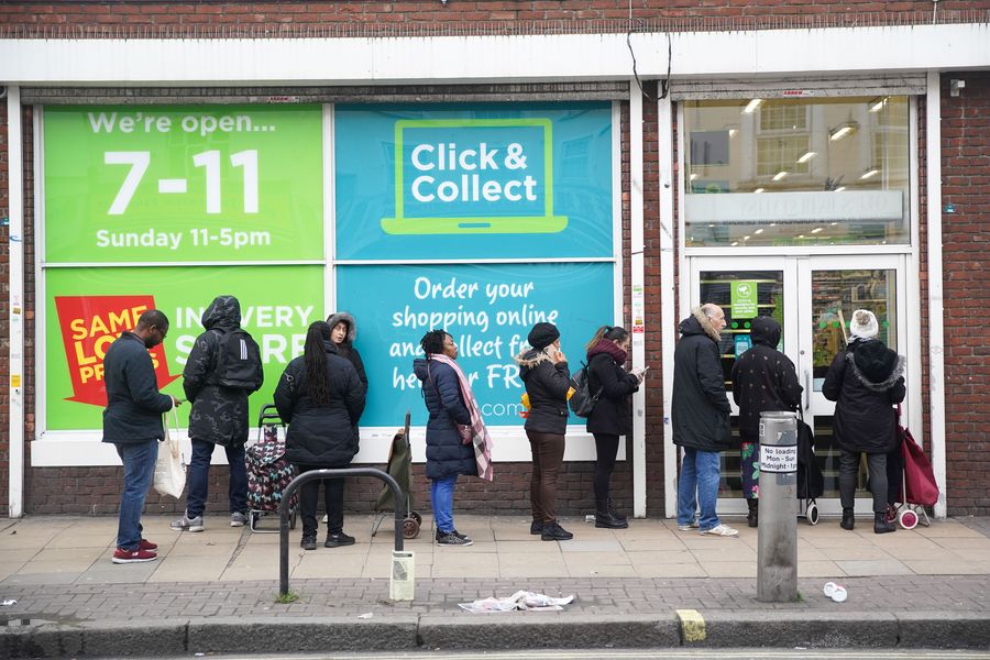Shoppers line up outside an Asda store in South London, Britain, on March 20, 2020. (Photo by Joe Newman/Xinhua)■