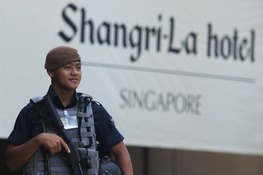 A police officer stands guard ahead of the 18th Shangri-La Dialogue held at Singapore's Shangri-La Hotel on May 31, 2019. (Xinhua/Then Chih Wey)