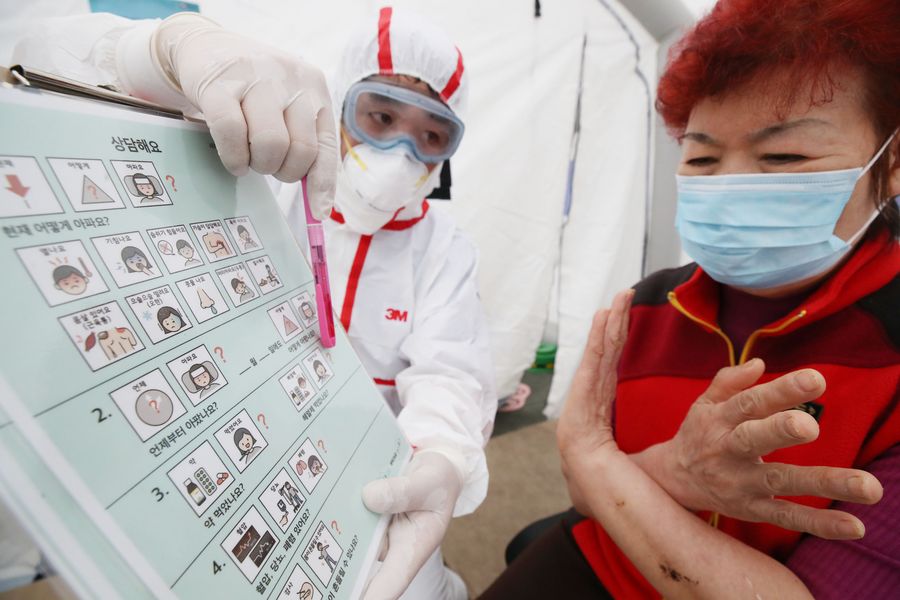 A staff member introduces the work process of the screening clinic to a woman in Seoul, South Korea, March 26, 2020. (NEWSIS/Handout via Xinhua) ■