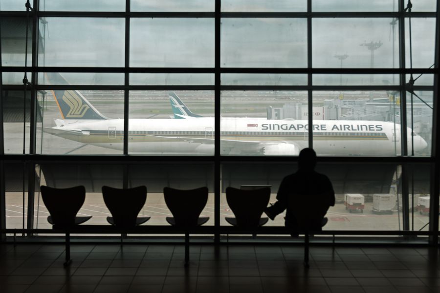 An airplane of Singapore Airlines parks on the tarmac of Singapore's Changi Airport on March 23, 2020. Singapore Airlines announced on Monday that it would cut 96 percent of its capacity till the end of April. (Photo by Then Chih Wey/Xinhua)