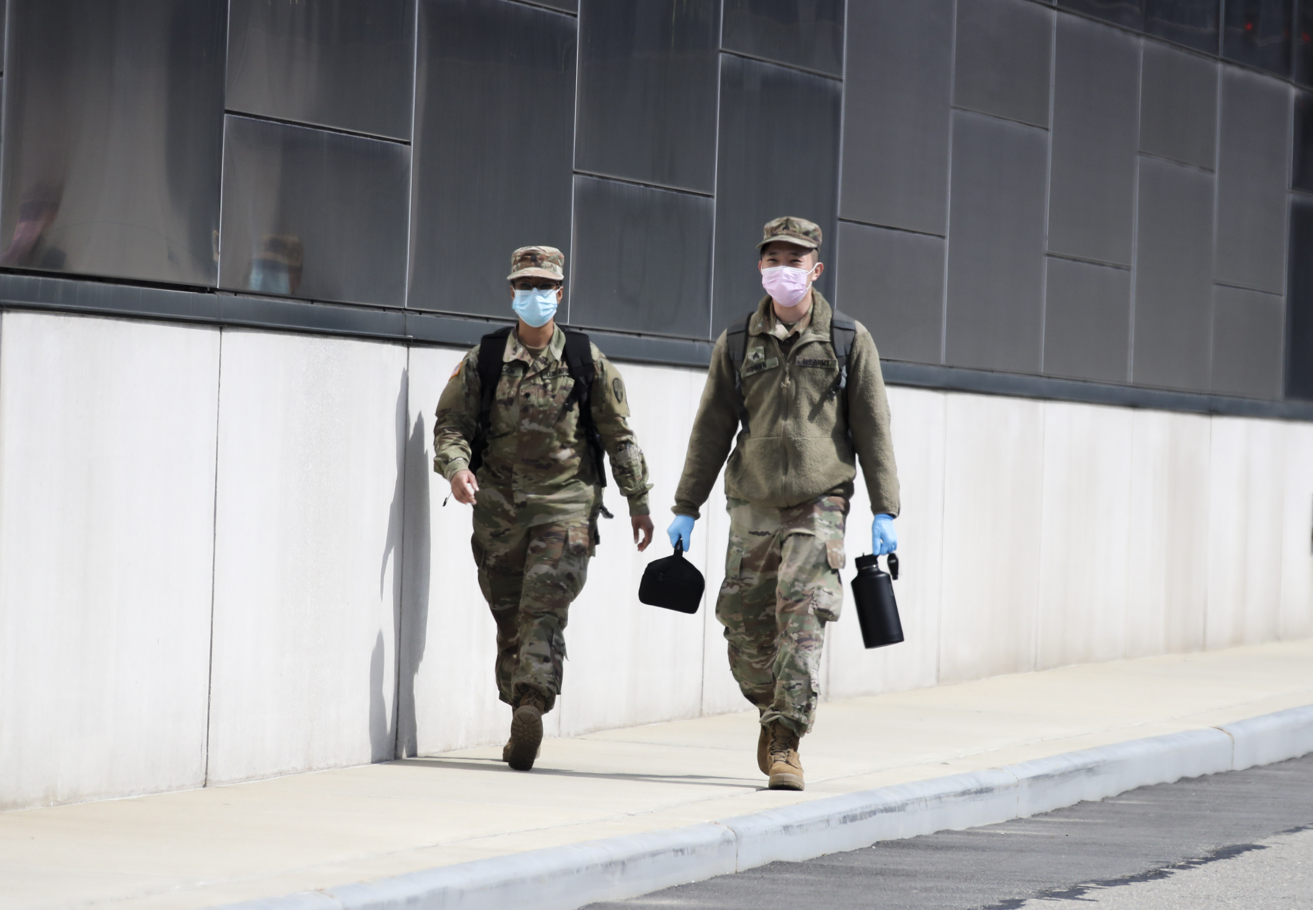 Members of U.S. army walk outside the Javits Convention Center, where an emergency hospital for coronavirus treatment is being built, in New York, the United States, March 24, 2020. (Xinhua/Wang Ying)