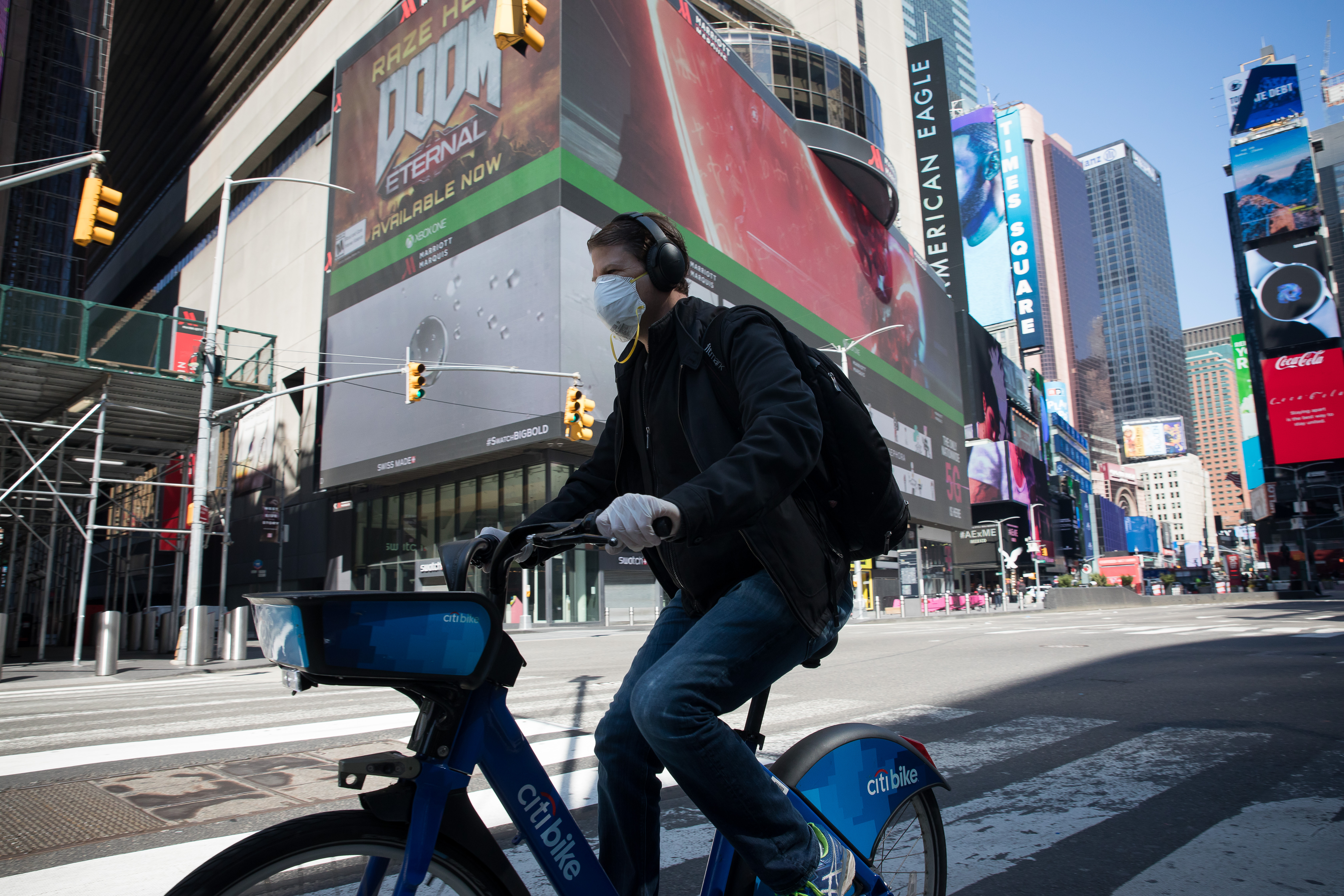A man wearing a face mask and gloves rides a bike at the Times Square in New York, the United States, March 26, 2020. (Photo by Michael Nagle/Xinhua)