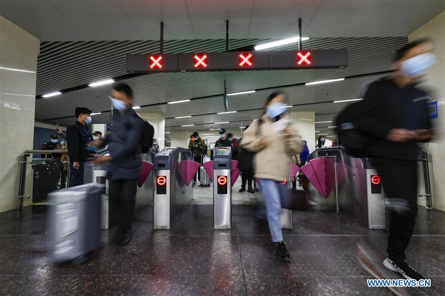 Passengers pass the ticket gates at the metro station of Hankou Railway Station in Wuhan, central China's Hubei Province, March 28, 2020. Six metro lines in Wuhan resumed operation starting from Saturday, a new sign that life is gradually returning to normal in the hardest-hit city. Passengers are required to scan the QR code for real-name registration and take temperature checks before taking the subway. Each train is equipped with a train safety crew member to help guide and serve the passengers. (Xinhua/Shen Bohan)
