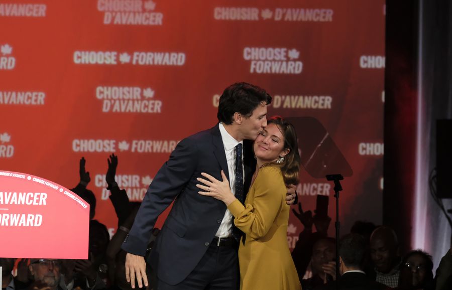 Canadian Prime Minister Justin Trudeau (L) kisses his wife Sophie Gregoire Trudeau at the Liberal Party campaign headquarters in Montreal, Canada, Oct. 21, 2019. (Photo by Raffi Kirdi/Xinhua)