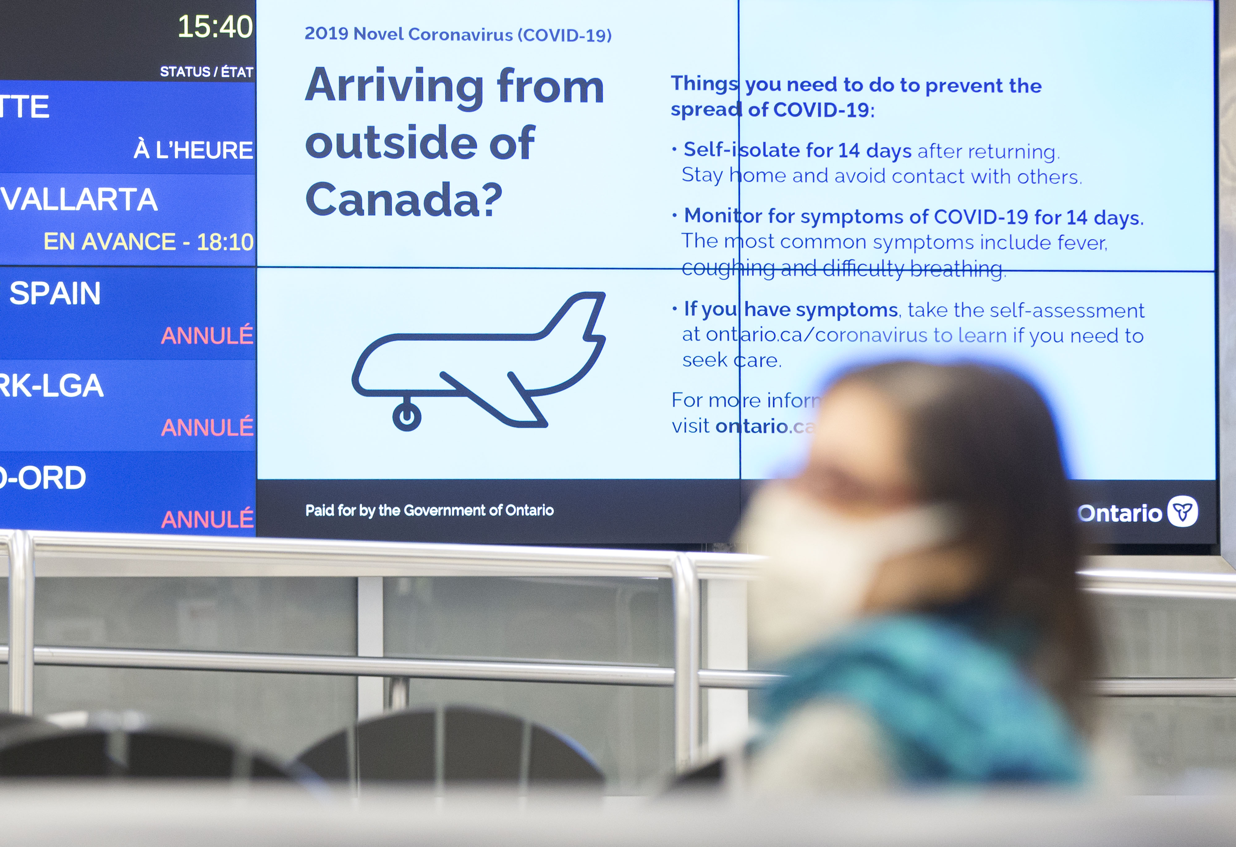 Travelers' isolation information is seen on a screen at the Pearson International Airport in Toronto, Canada, on March 26, 2020. (Photo by Zou Zheng/Xinhua)