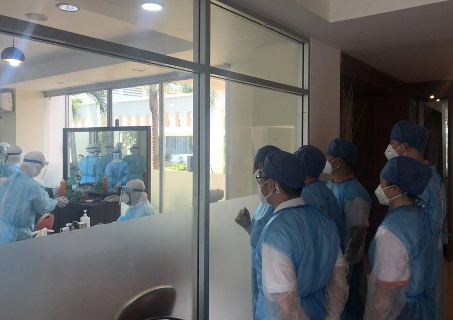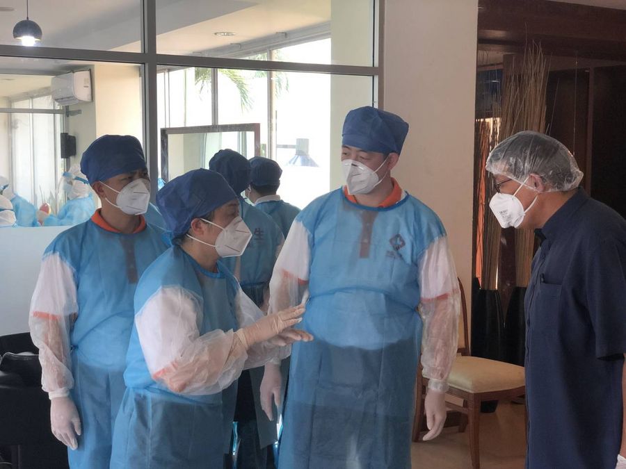Chinese medical experts visit a quarantine in Sihanoukville city in Preah Sihanouk province, Cambodia, March 28, 2020. (Xinhua/Chen Duncai)