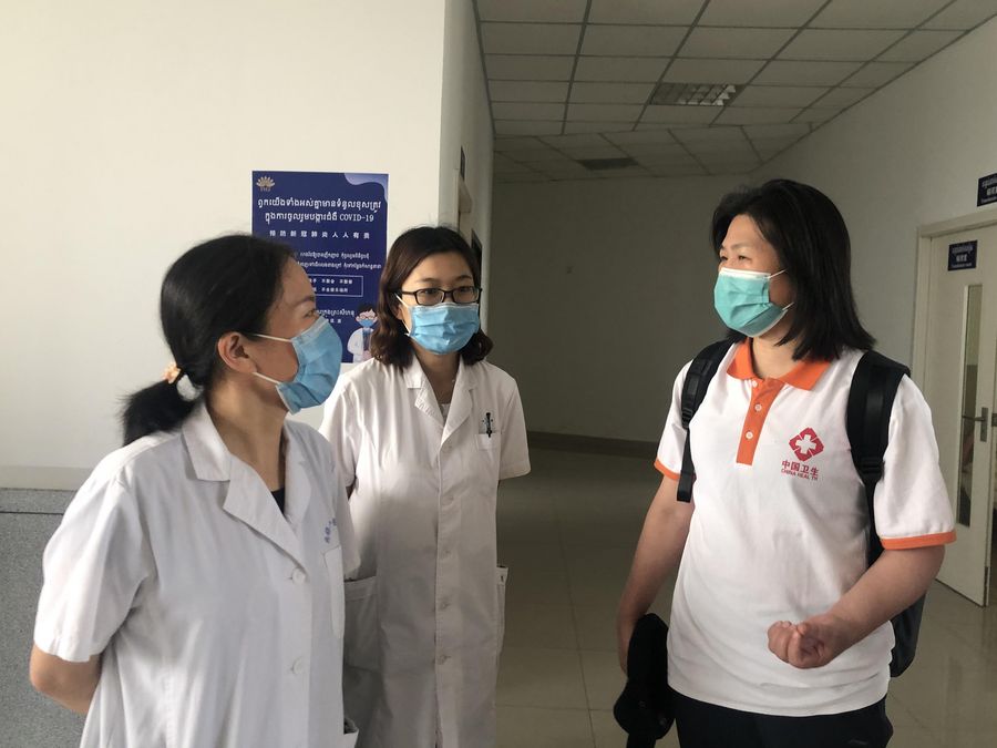 Huang Luying (R), a Chinese medical expert, communicates with local medical workers at the Sihanoukville Special Economic Zone in Preah Sihanouk province, Cambodia, March 27, 2020. (Xinhua/Chen Duncai)