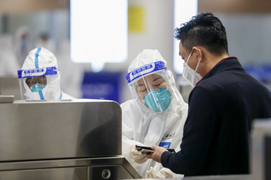 A border inspection police officer checks information of a newly arrived inbound passenger in Chongqing, southwest China, March 29, 2020. (Xinhua/Huang Wei)