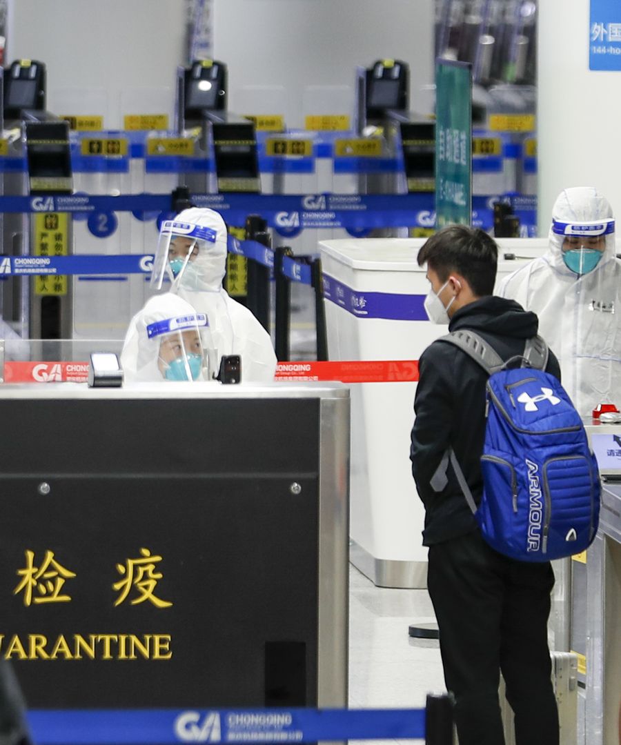 Staff members of the customs check the health declaration information of newly arrived inbound passengers in Chongqing, southwest China, March 29, 2020. (Xinhua/Huang Wei)