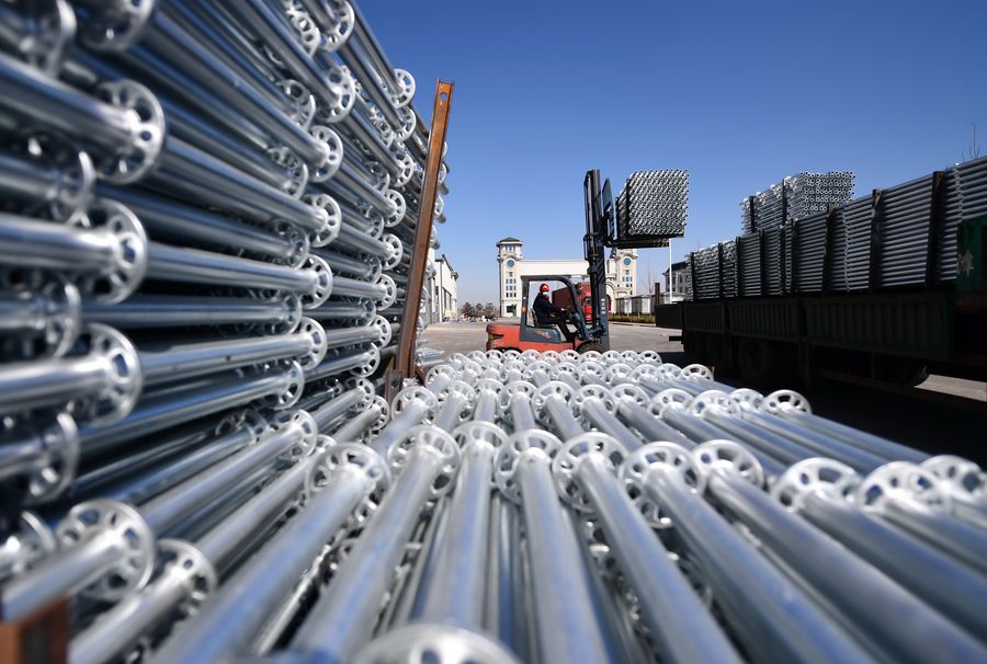 A staff operates machinery equipment at a logistics enterprise in Tangshan, north China's Hebei Province, March 30, 2020. Tangshan has seen 99.9 percent of the industrial enterprises above designated size resume operation as a raft of supportive policies started to take effect. (Xinhua/Yang Shiyao)