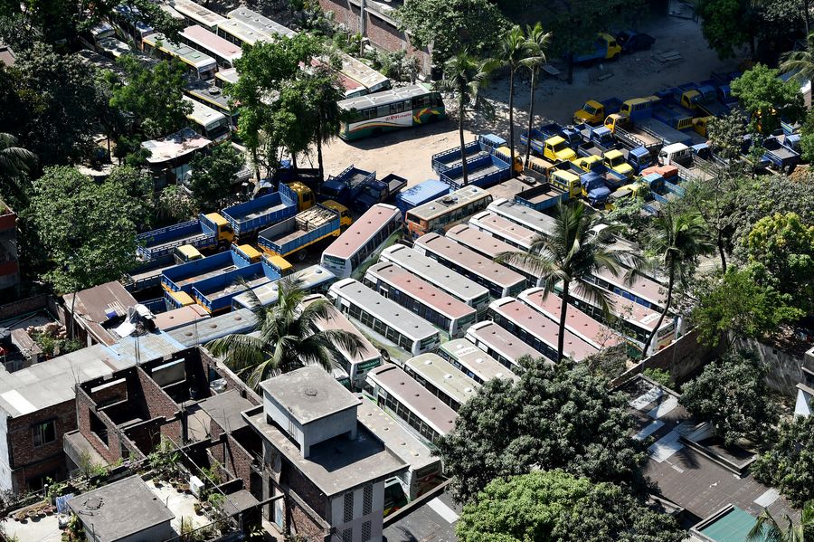 Buses park in a depot in Dhaka, Bangladesh, on March 29, 2020, as the government declares a 10-day shut down to battle the spread of COVID-19. (Str/Xinhua)
