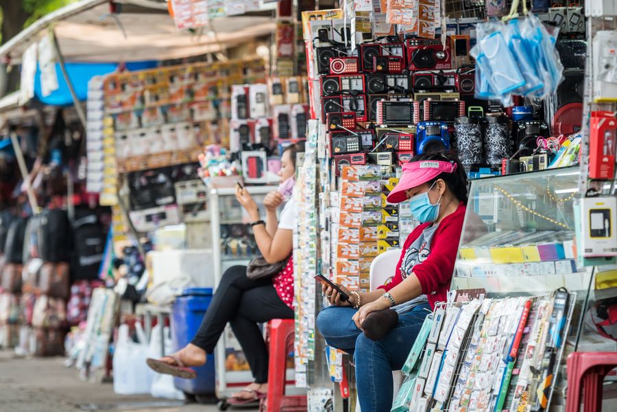 Venders wearing face masks wait for customers along the street in Vientiane, Laos, March 23, 2020. (Photo by Kaikeo Saiyasane/Xinhua)