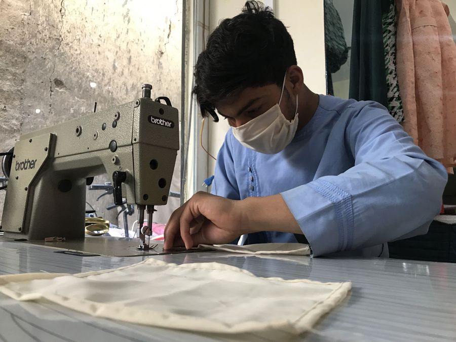 An Afghan man makes masks to donate for local residents in Kandahar city, Afghanistan, March 19, 2020. (Photo by Arghand/Xinhua)