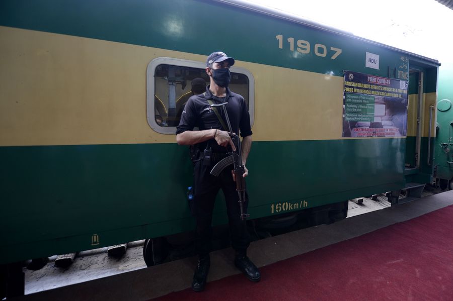 A policeman wearing face mask stands outside a train compartment converted into a quarantine ward at a railway station in Rawalpindi of eastern Pakistan's Punjab province on March 30, 2020. (Xinhua/Ahmad Kamal)