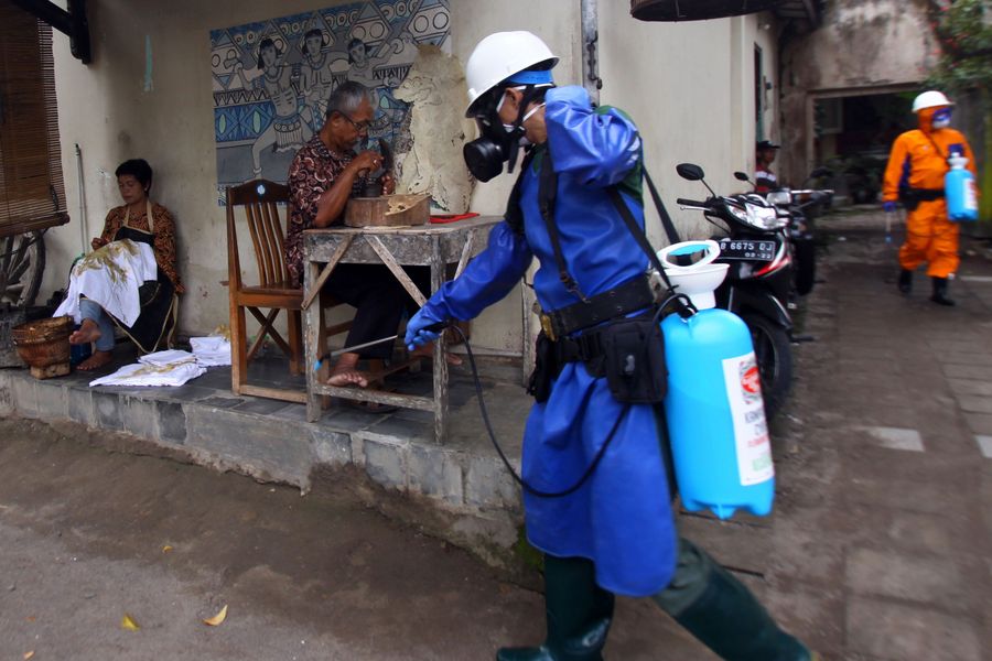 A man sprays disinfectant outside a residence in Taman Sari of Yogyakarta, Indonesia, March 31, 2020. (Photo by Damar/Xinhua)