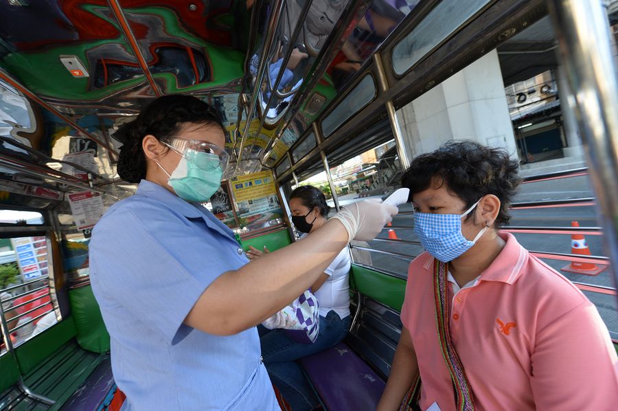 A staff member checks the body temperature of a passenger at a screening point in Bangkok, Thailand, March 26, 2020. (Xinhua/Rachen Sageamsak)