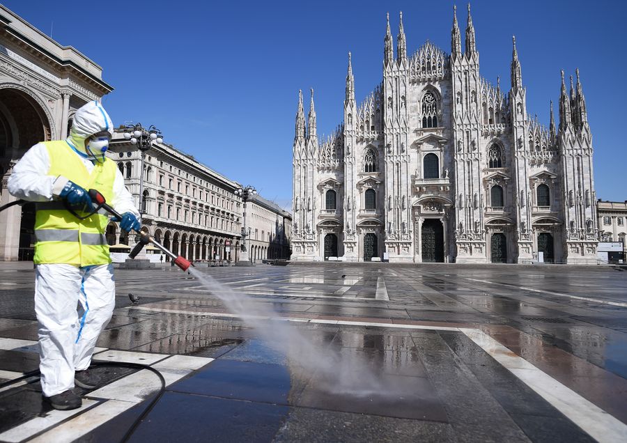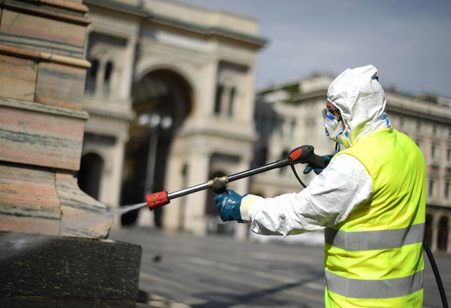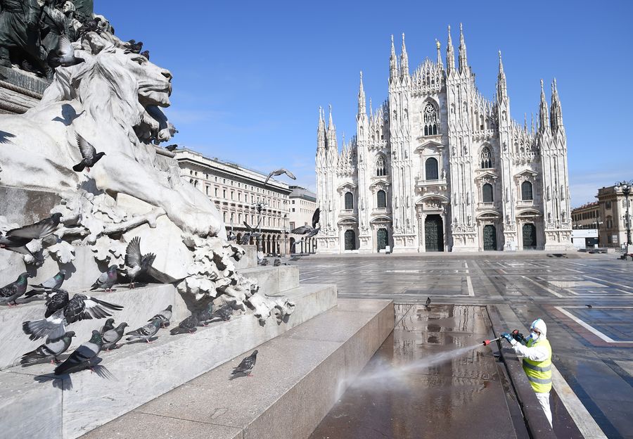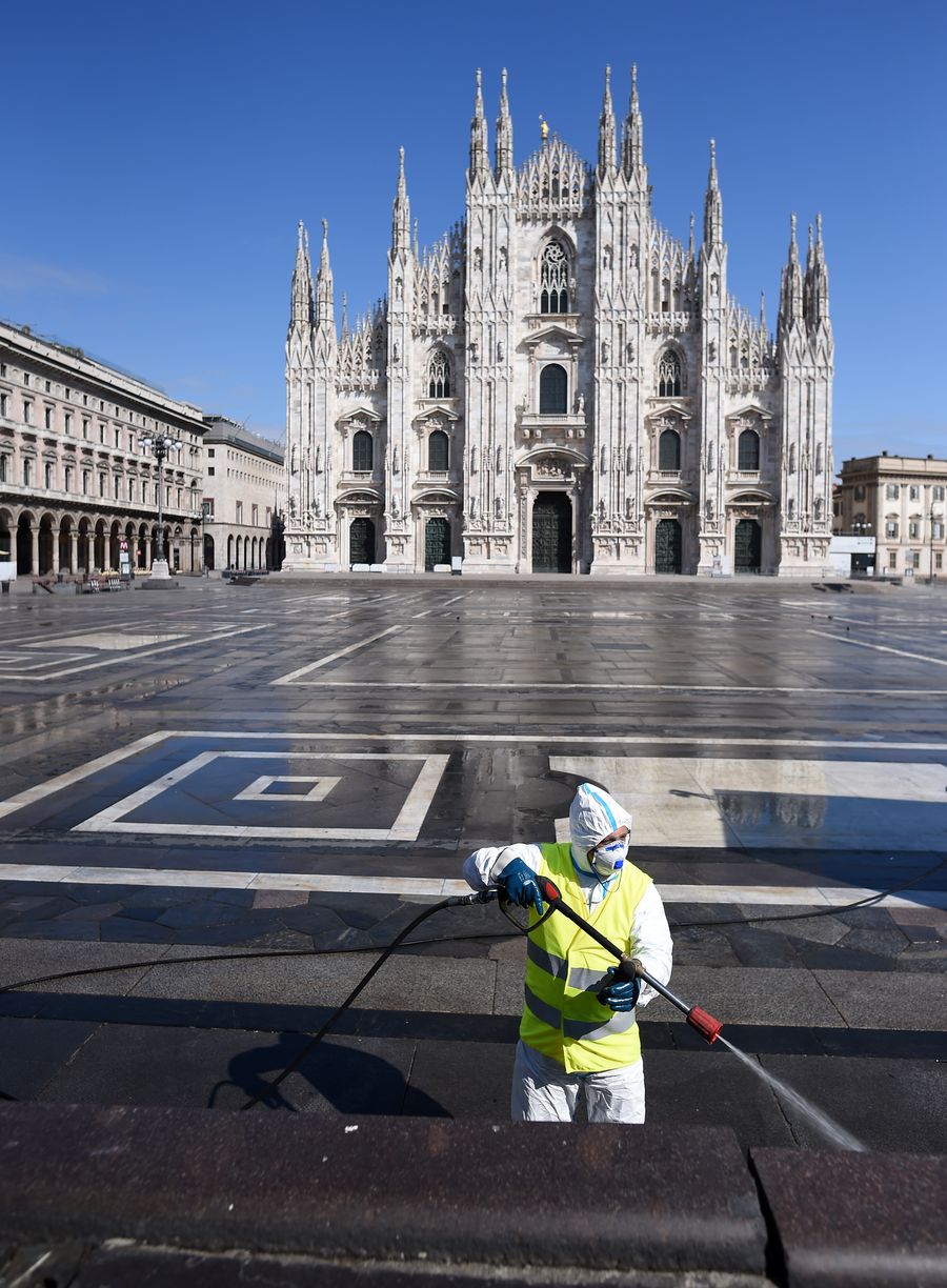 A sanitation worker wearing a protective suit and a face mask cleans the ground at Piazza del Duomo in Milan, Italy, on March 31, 2020. (Photo by Daniele Mascolo/Xinhua)