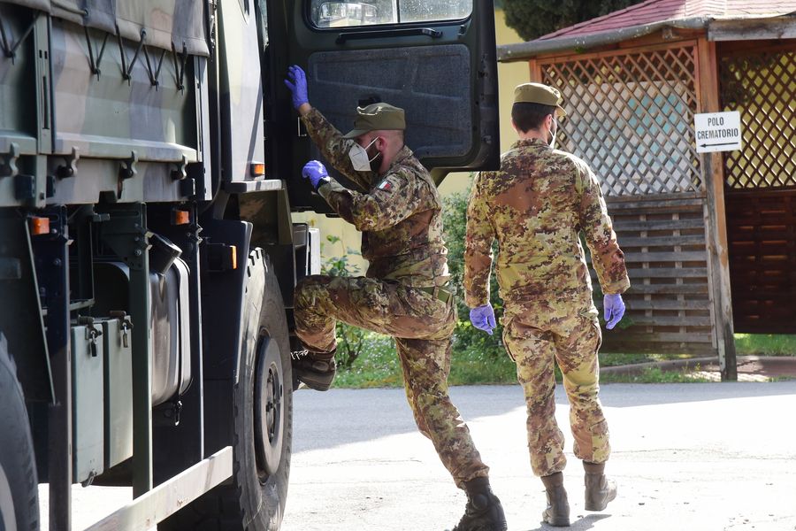 Soldiers are seen near a military truck carrying bodies of patients who died from COVID-19 infections from Lombardy, in Bologna, Italy, on March 31, 2020. (Photo by Gianni Schicchi/Xinhua)