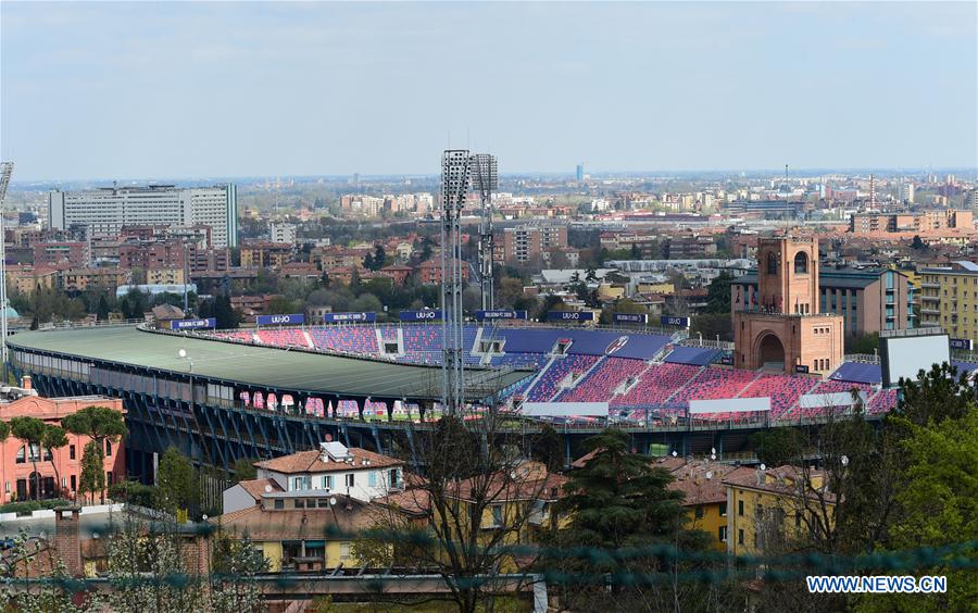 A stadium is seen empty in Bologna, Italy, on April 1, 2020. Italy registered a total of 110,574 COVID-19 cases as of Wednesday, and the death toll stood at 13,155, according to fresh figures released by the country's Civil Protection Department managing the national emergency response. (Photo by Gianni Schicchi/Xinhua)
