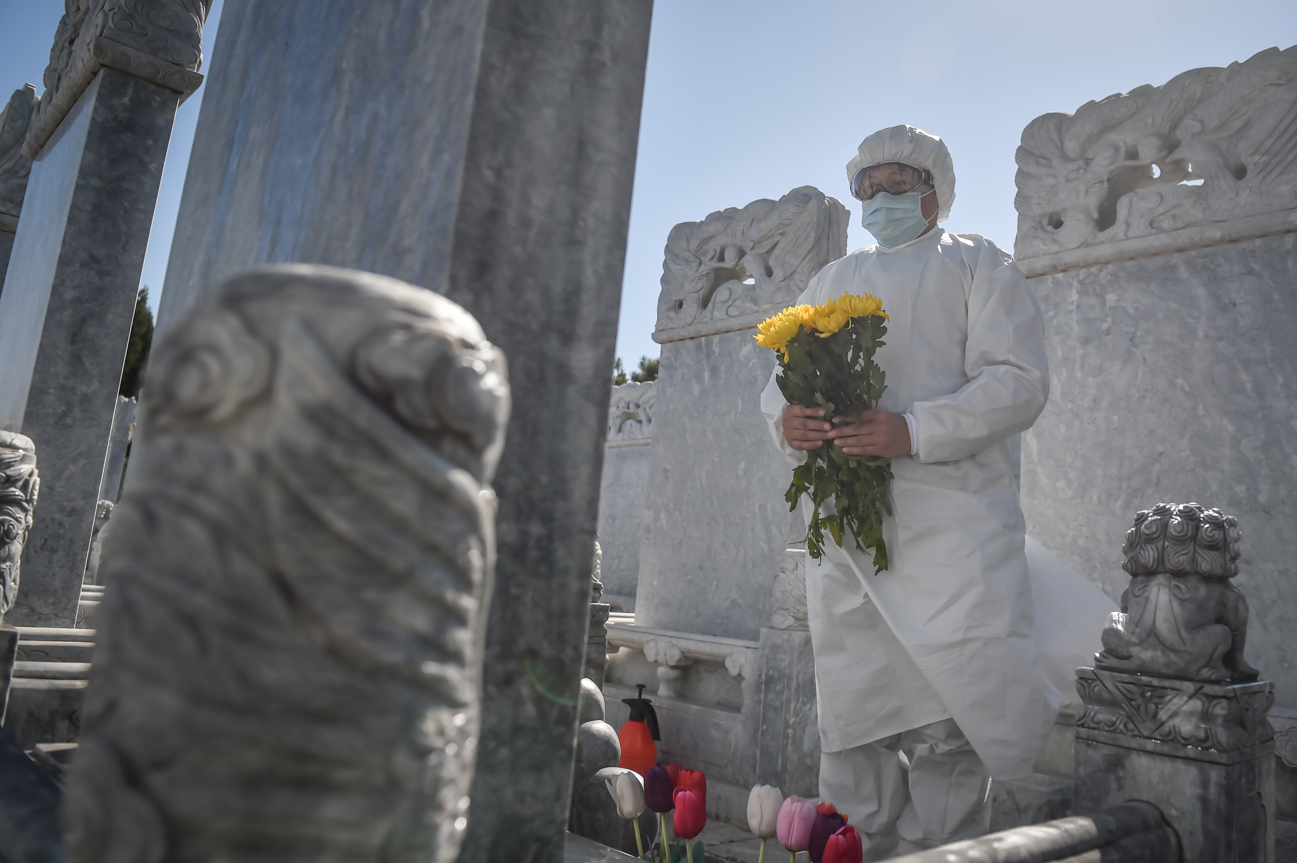 A cemetery staff member offers flowers to the deceased at the Babaoshan People's Cemetery in Beijing, capital of China, March 28, 2020. (Xinhua/Peng Ziyang)