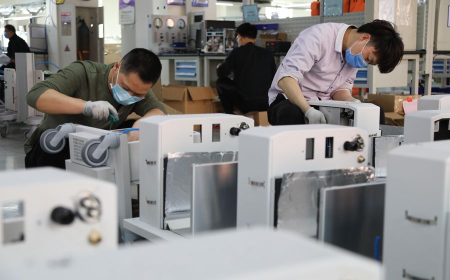 In a factory in Yanjiao, a town near Beijing inside the border of north China's Hebei Province, workers are busy testing, assembling and packing ventilators to catch up to the backlogs, making sure the devices can be delivered overseas as soon as possible.
