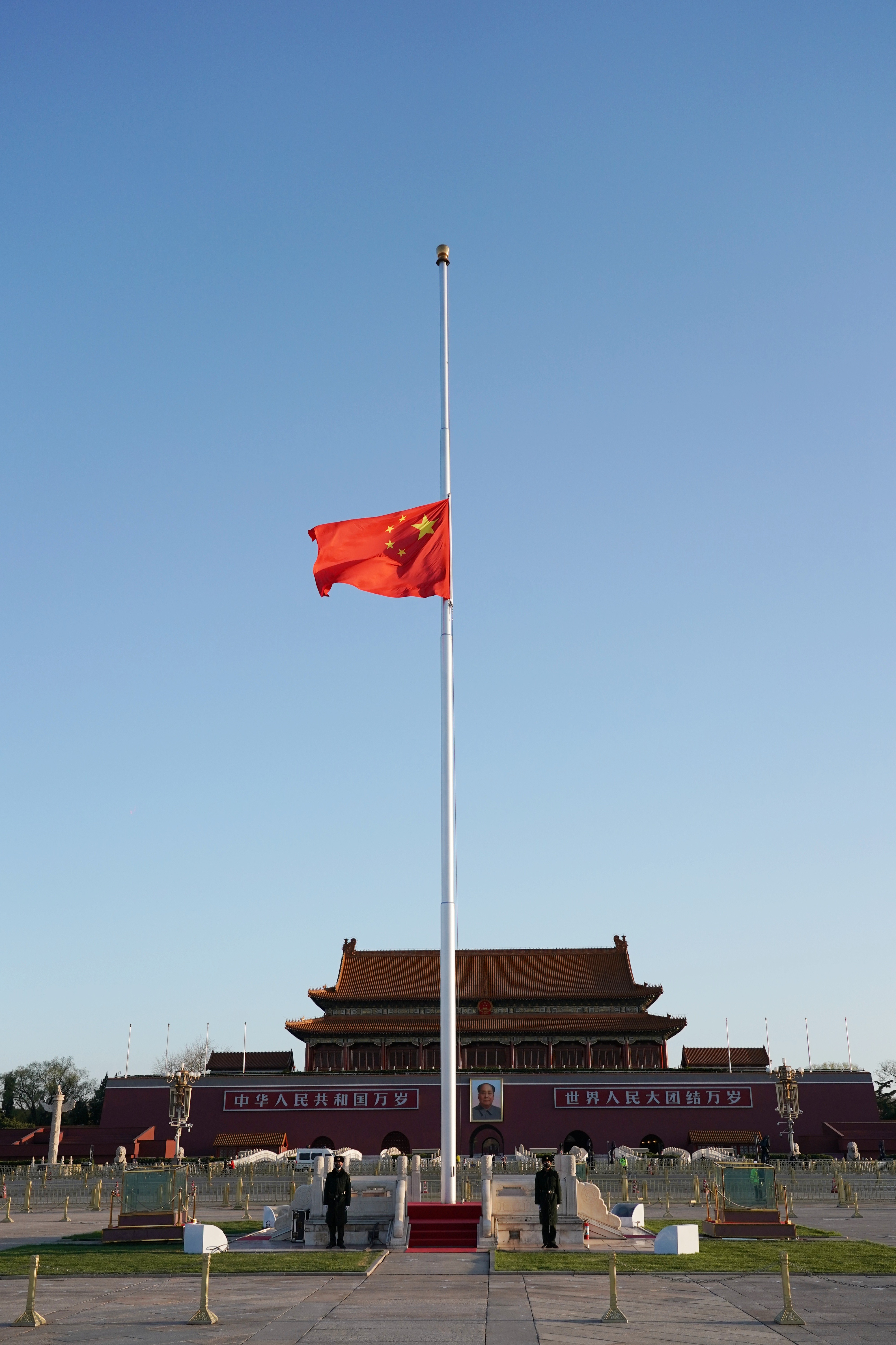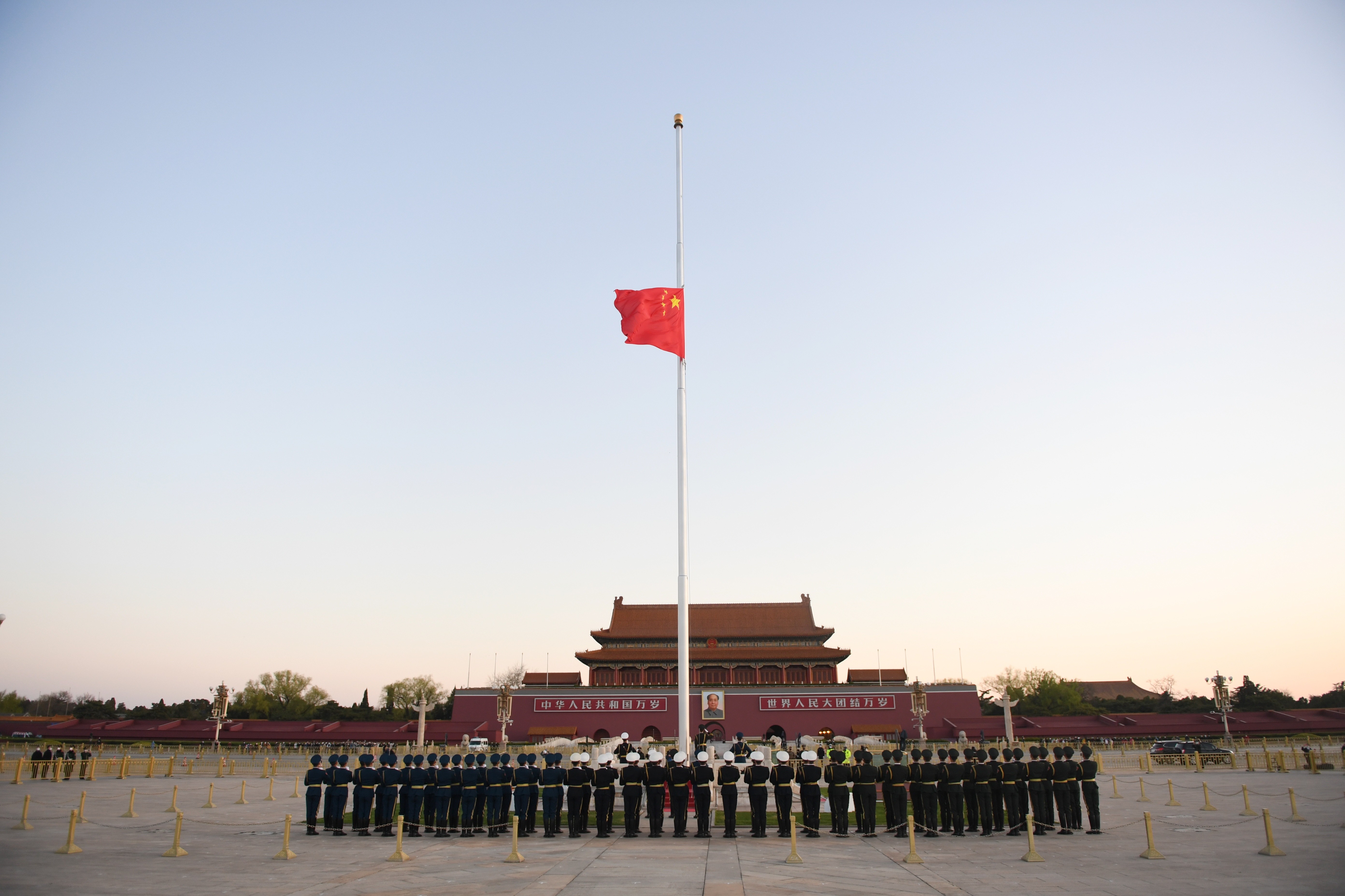 A Chinese national flag flies at half-mast to mourn for martyrs who died in the fight against the novel coronavirus disease (COVID-19) outbreak and compatriots died of the disease at Tian'anmen Square in Beijing, capital of China, April 4, 2020. (Xinhua/Peng Ziyang)