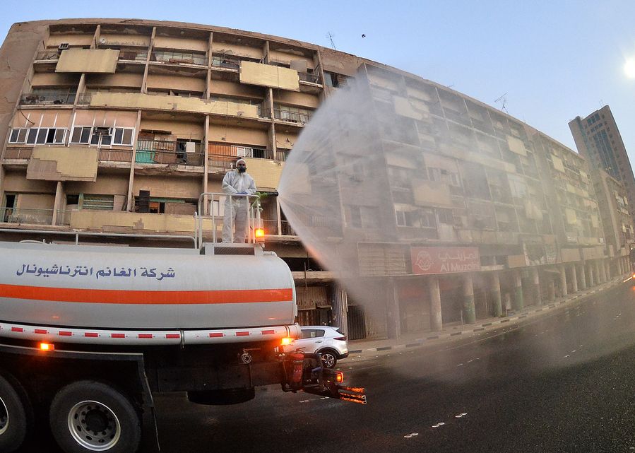 A truck disinfects a street in Kuwait City, Kuwait, on April 3, 2020. Kuwait reported on Friday 75 new COVID-19 cases, bringing the total number in the country to 417, the Health Ministry said in a statement. (Xinhua/Asad)