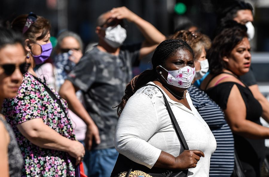 People wearing face masks are seen in Santiago, Chile, March 20, 2020. (Photo by Jorge Villegas/Xinhua)