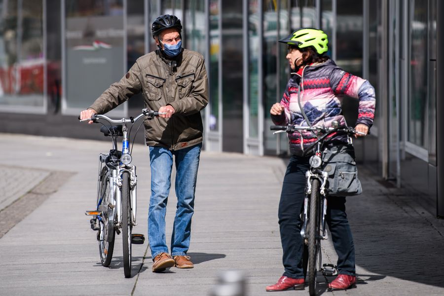 Two cyclists talk on a road in Leipzig, eastern Germany, April 4, 2020. (Photo by Kevin Voigt/Xinhua)