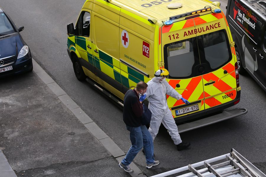 An emergency medical staff member leads a man to an ambulance in Brussels, Belgium, on April 2, 2020. (Xinhua/Zhang Cheng)