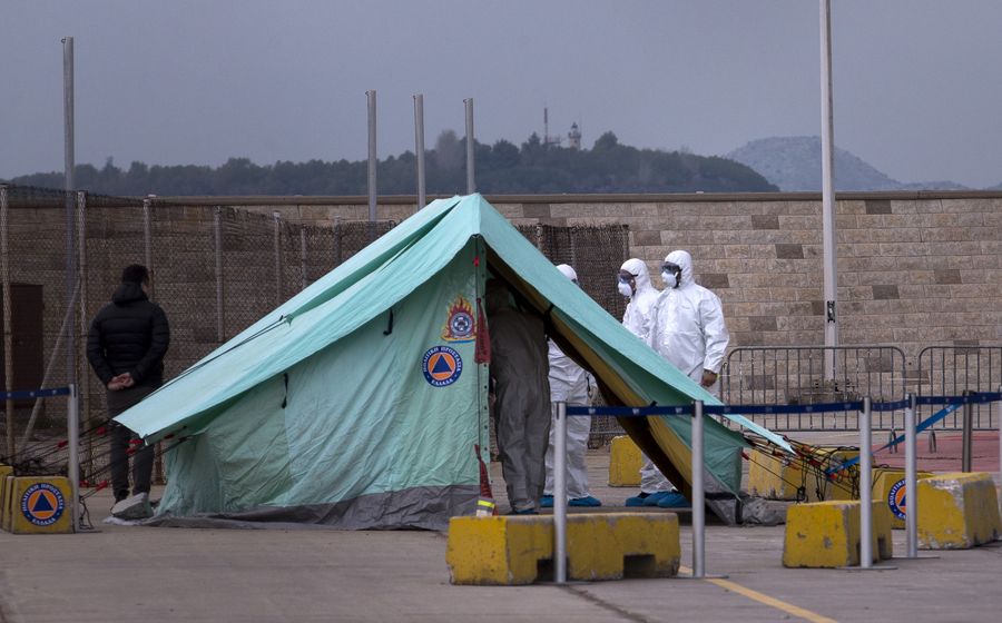 Medical workers are seen by a tent in Piraeus, Greece, on April 3, 2020. (Xinhua/Marios Lolos)