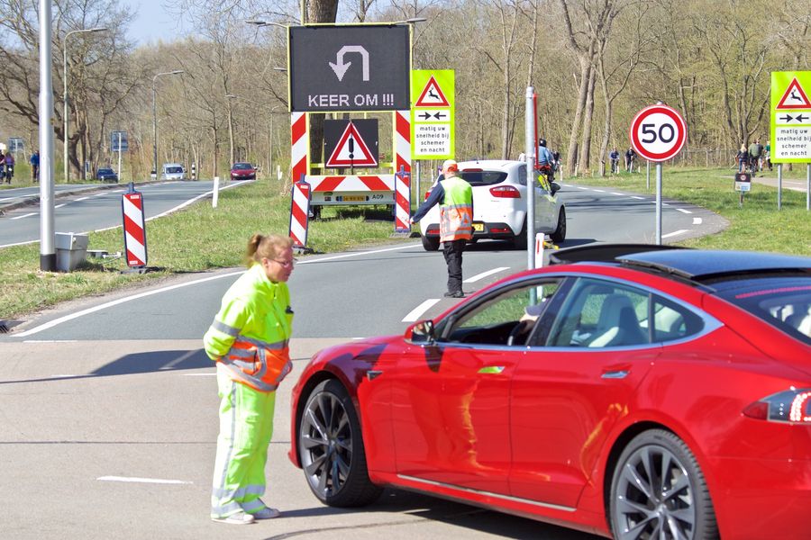 Officials keep close watch on cars in Overveen, the Netherlands, April 5, 2020. (Photo by Sylvia Lederer/Xinhua)