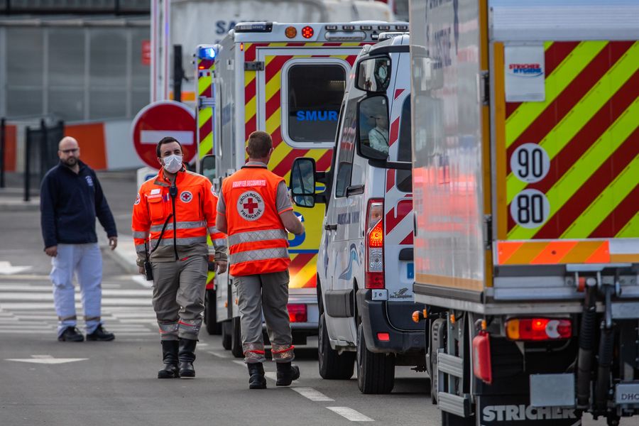 Medical staff and ambulances arrive on April 3 at the Orly Airport in Paris, from where the coronavirus patients will be transferred by military helicopters to southern France to receive treatment. (Photo by Aurelien Morissard/Xinhua)