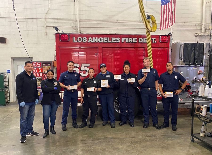 LA firefighters pose for photos in Los Angeles, after they received face masks donated by Chinese American people from the Chinese-American community in Palos Verdes and the Greater South Bay area in Southern California, the United States, on March 26, 2020. (Xinhua)