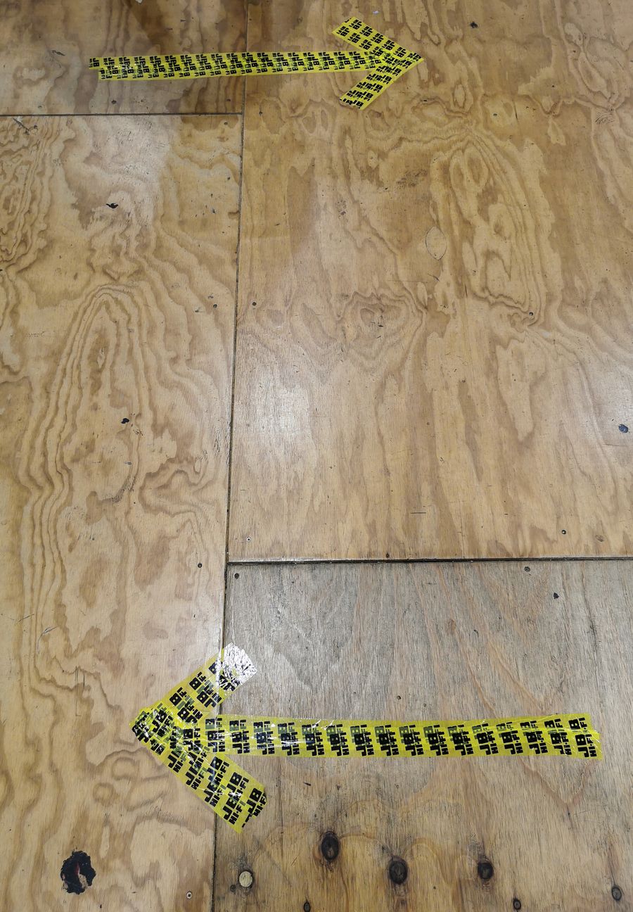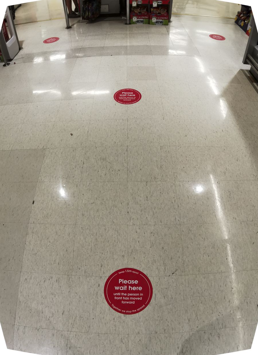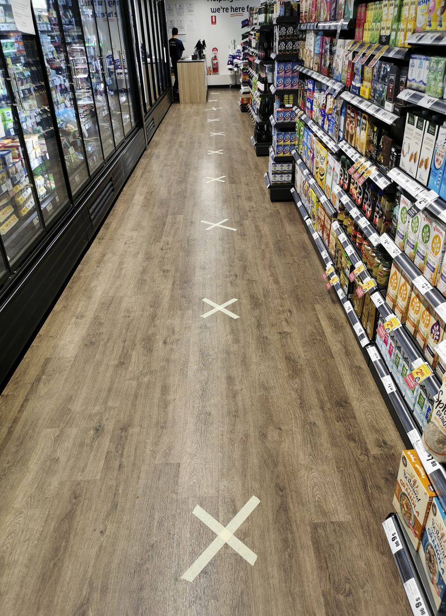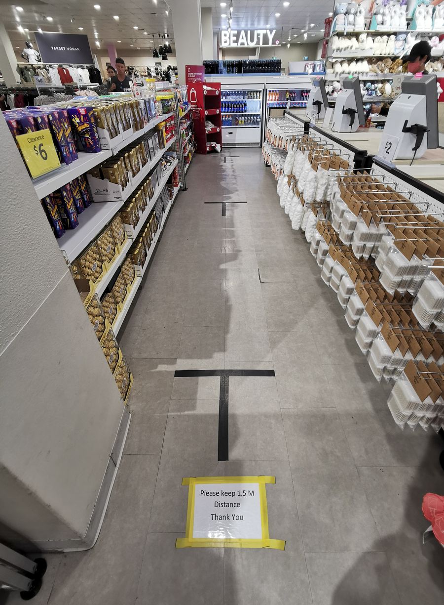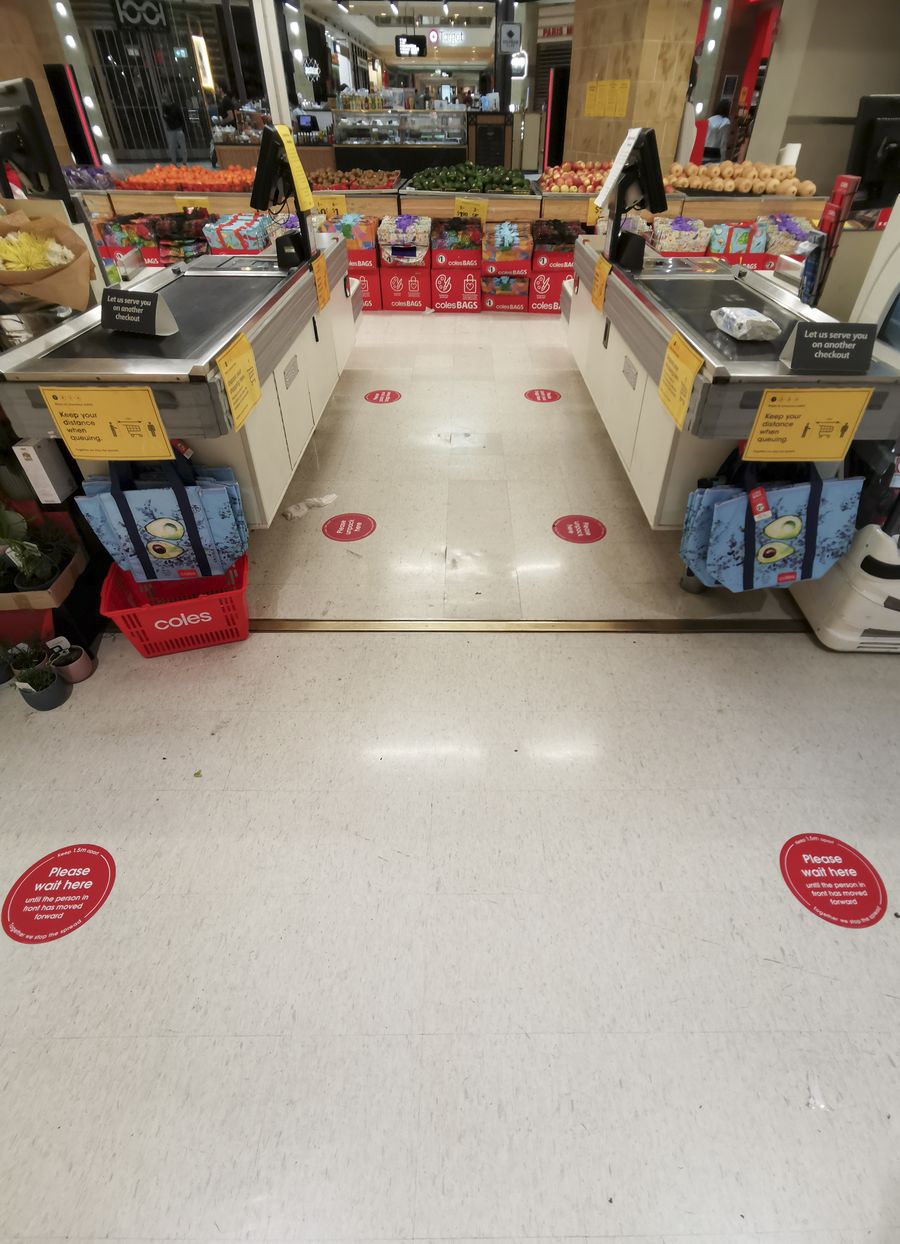 Photo taken on April 5, 2020 shows marks on the ground reminding people of social distancing at a supermarket in Sydney, Australia. (Xinhua/Bai Xuefei)