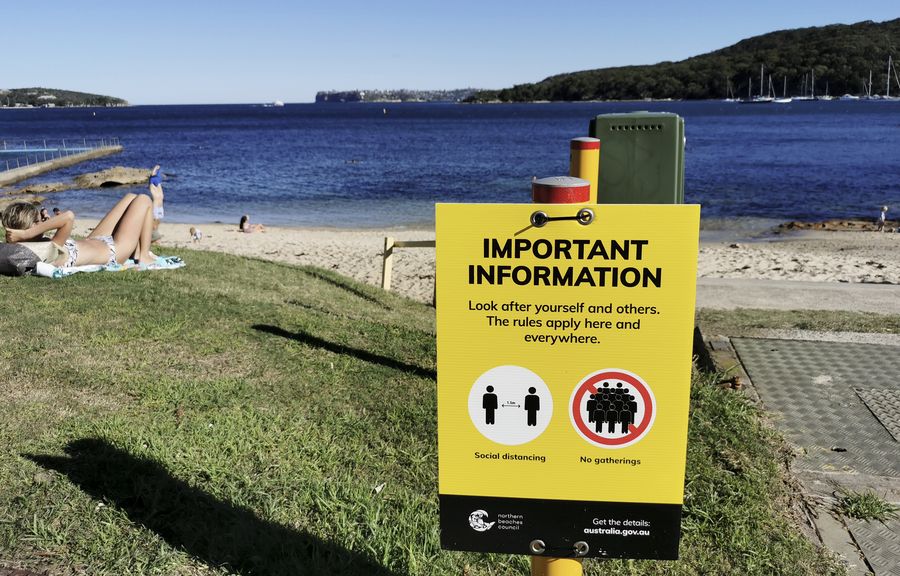 Photo taken on April 4, 2020 shows a notice on the beach reminding people of social distancing in Sydney, Australia. (Xinhua/Bai Xuefei)
