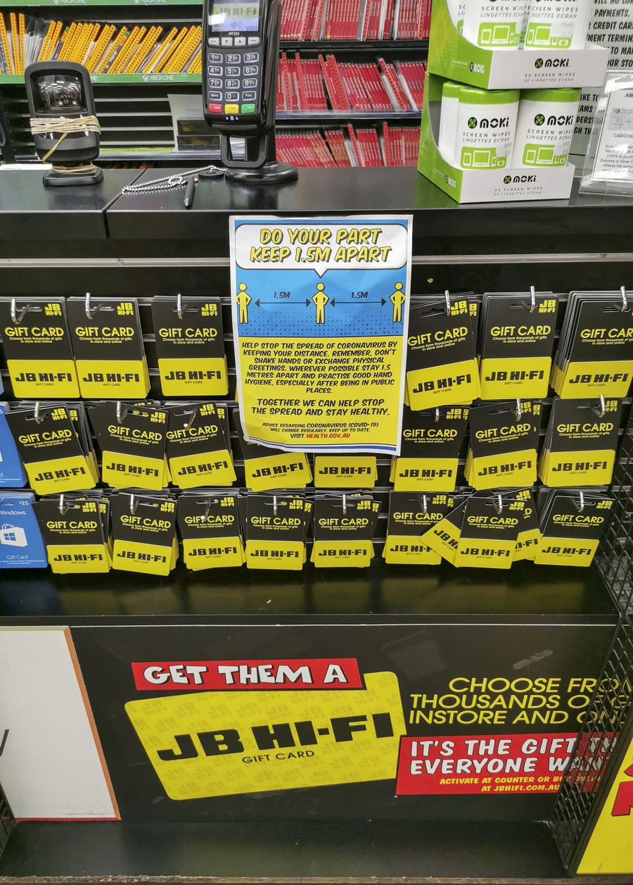 Photo taken on April 5, 2020 shows a notice on the cashier reminding people of social distancing at a shopping centre in Sydney, Australia. (Xinhua/Bai Xuefei)