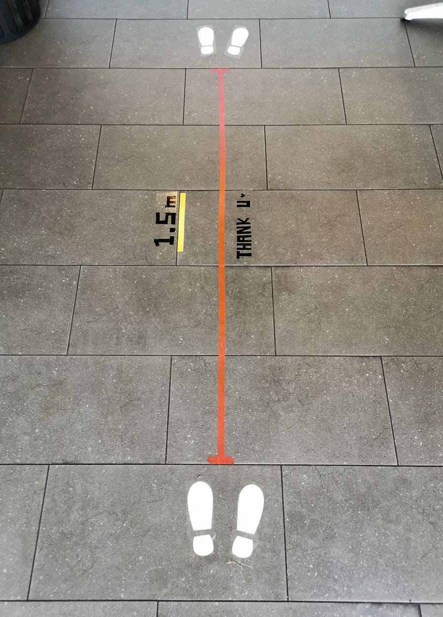 Photo taken on April 5, 2020 shows marks on the ground reminding people of social distancing at a shopping centre in Sydney, Australia. (Xinhua/Bai Xuefei)■