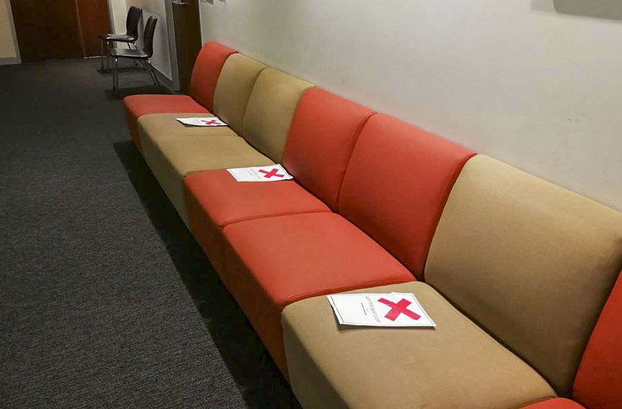 Photo taken on March 25, 2020 shows marks on the sofa reminding people of social distancing at a clinic in Melbourne, Australia. (Photo by Gui Qing/Xinhua)