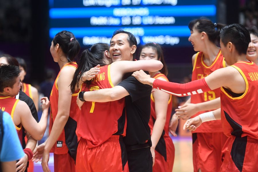 Chinese players hug their head coach Xu Limin after winning women's basketball final between China and the unified team of the Democratic People's Republic of Korea (DPRK) and South Korea at the 18th Asian Games 2018 in Jakarta, Indonesia, Sept. 1, 2018. (Xinhua/Huang Zongzhi)