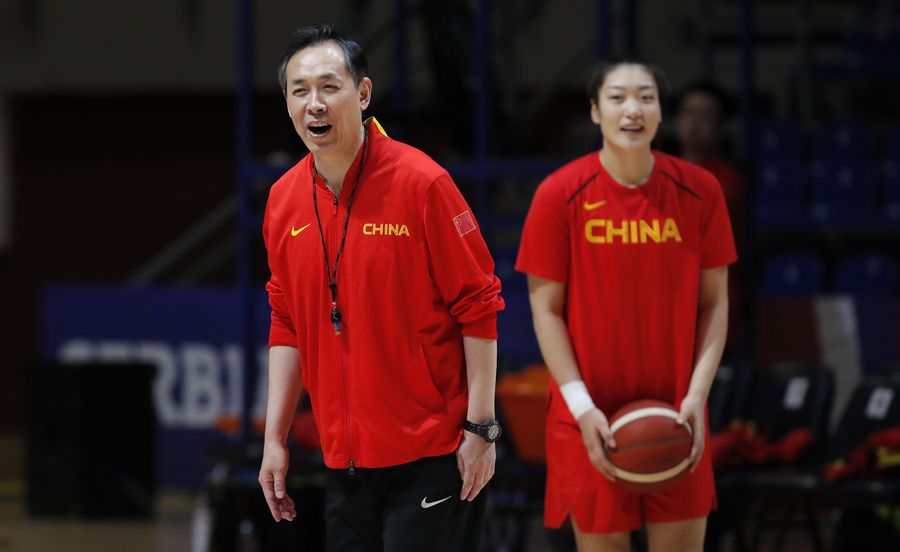 China's head coach Xu Limin (L) reacts during a training session prior to the women's Olympic qualifying basketball tournament in Belgrade, Serbia, on Feb. 5, 2020. China will face Britain, Spain and South Korea in Group B, with three top teams from each group set to advance to Tokyo 2020 Women's Olympic Basketball Tournament. (Photo by Predrag Milosavljevic/Xinhua)