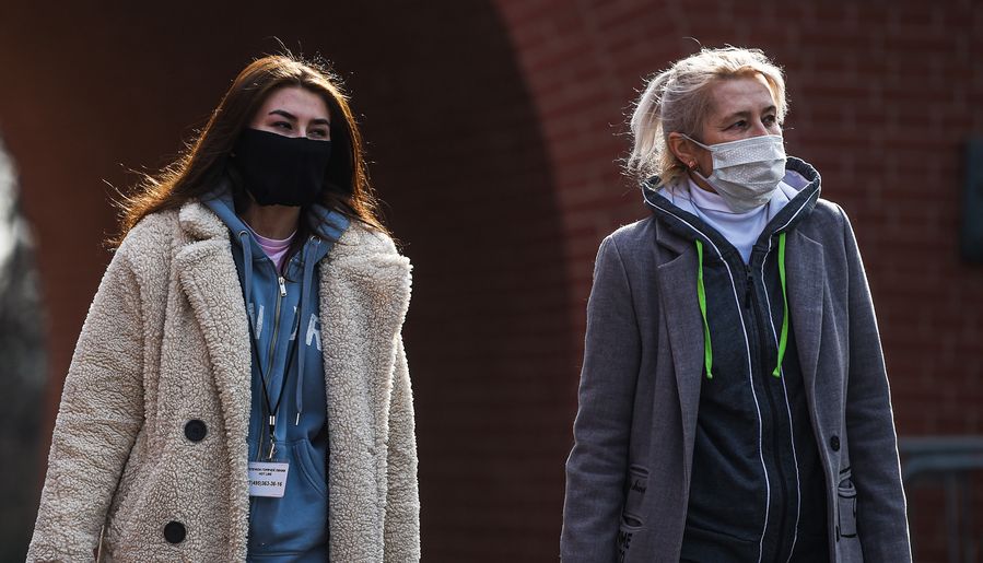 People wearing protective masks walk in Moscow, Russia, on March 27, 2020. (Photo by Evgeny Sinitsyn/Xinhua)
